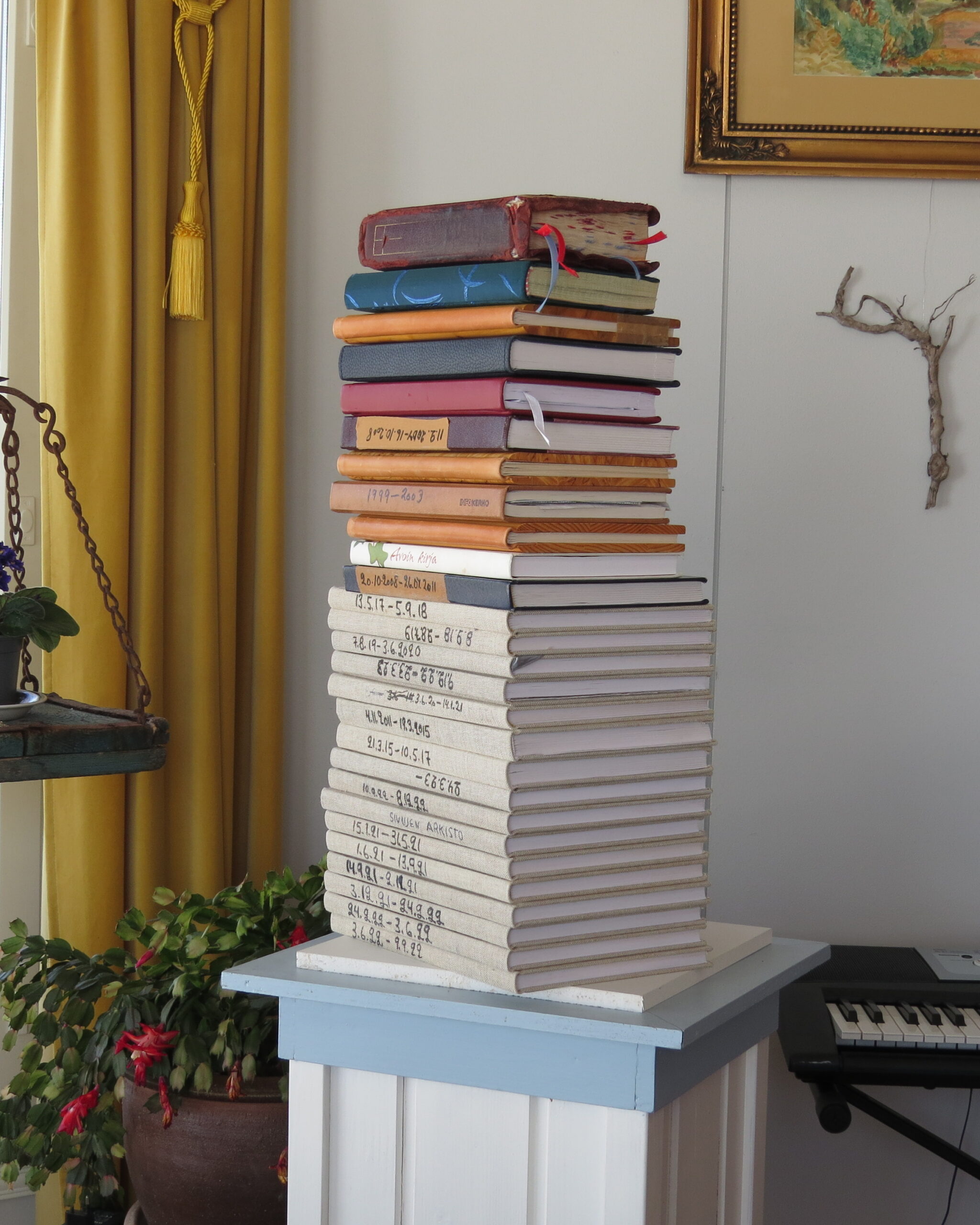 kuvassa osa minun omat päiväkirjani vuosilta 1986-2026  joita on nyt  n. 40 kpl